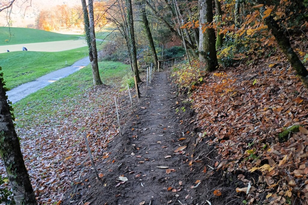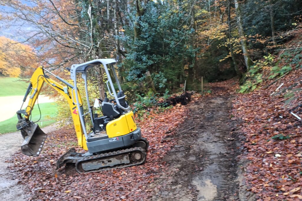 Nous avons utilisé notre pelle mécanique 1.7t afin de créer l’assise. Sa faible largeur nous a permis de conserver un aspect « sentier ».